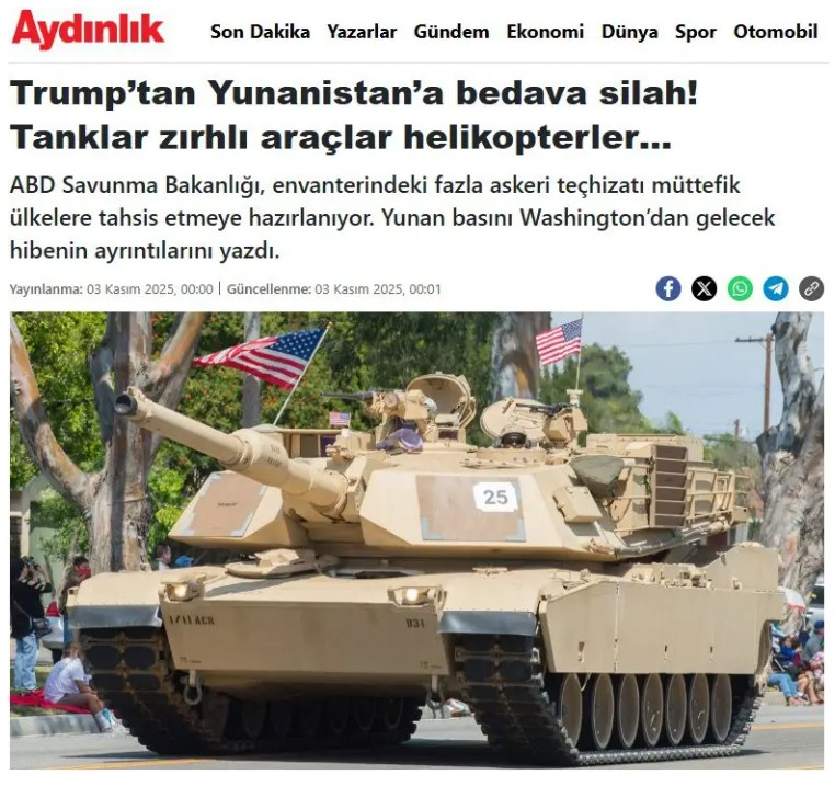 Στο στόχαστρο της εθνικιστικής Aydınlık η αμυντική ενίσχυση από ΗΠΑ! Ο Τραμπ εξοπλίζει δωρεάν Ελλάδα με άρματα και drones